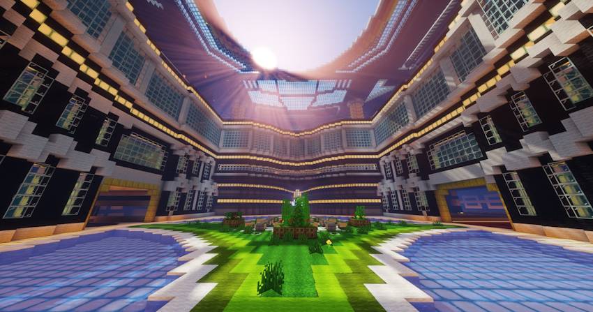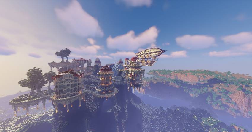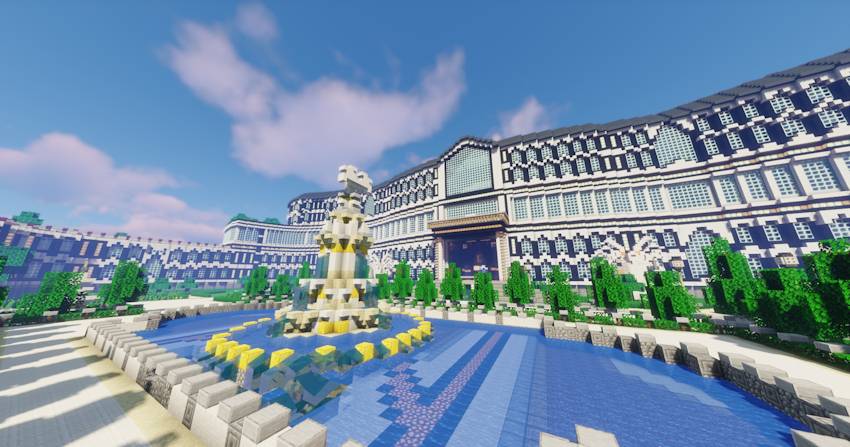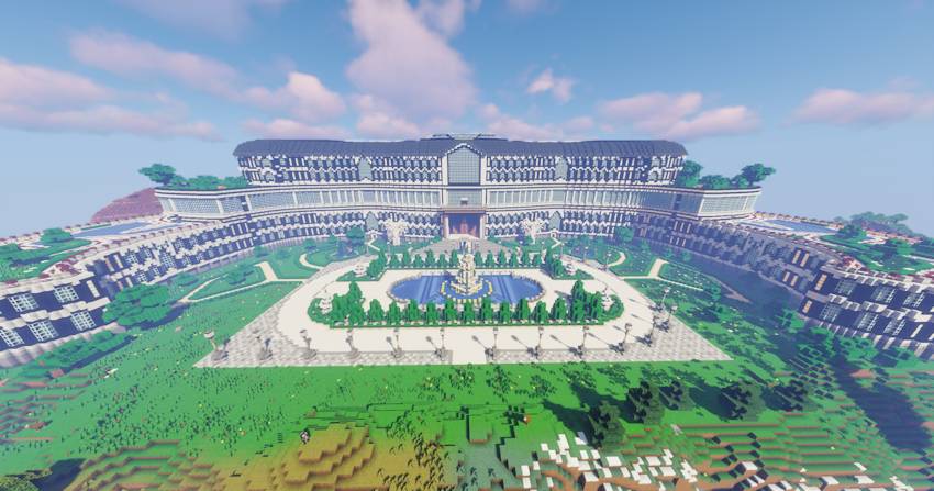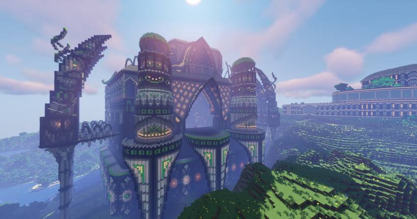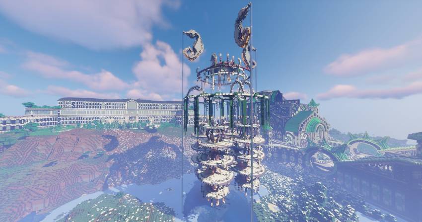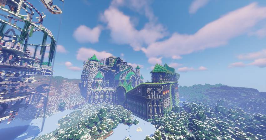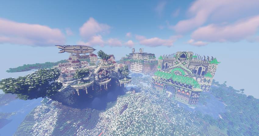 The map consists of four megastructures, including a large ice city, a large green castle, a huge mansion with large gardens, and a large decorative structure that can be used as a farming area.